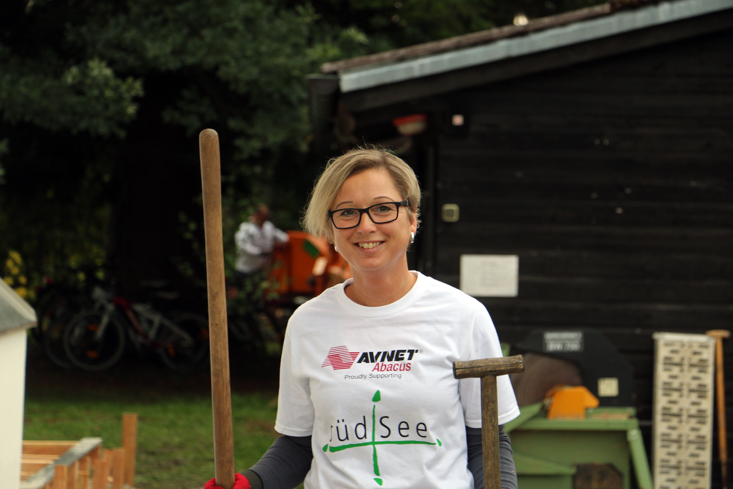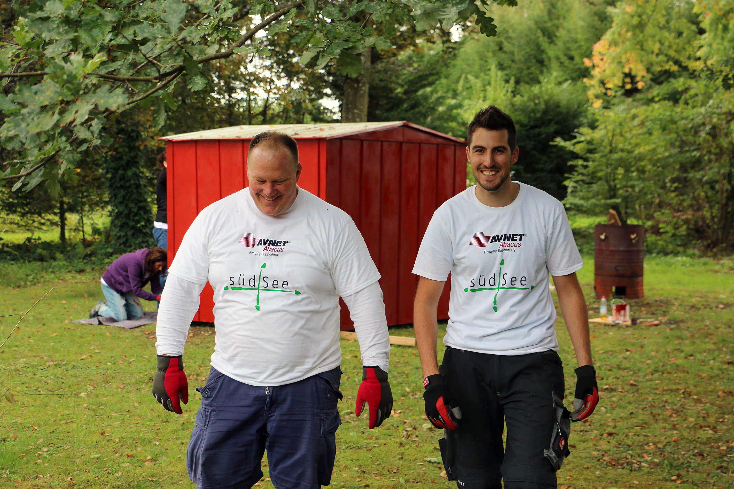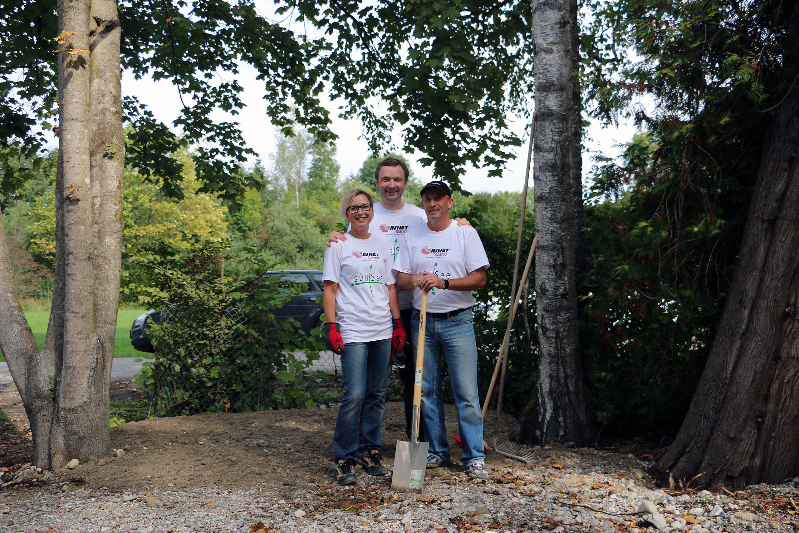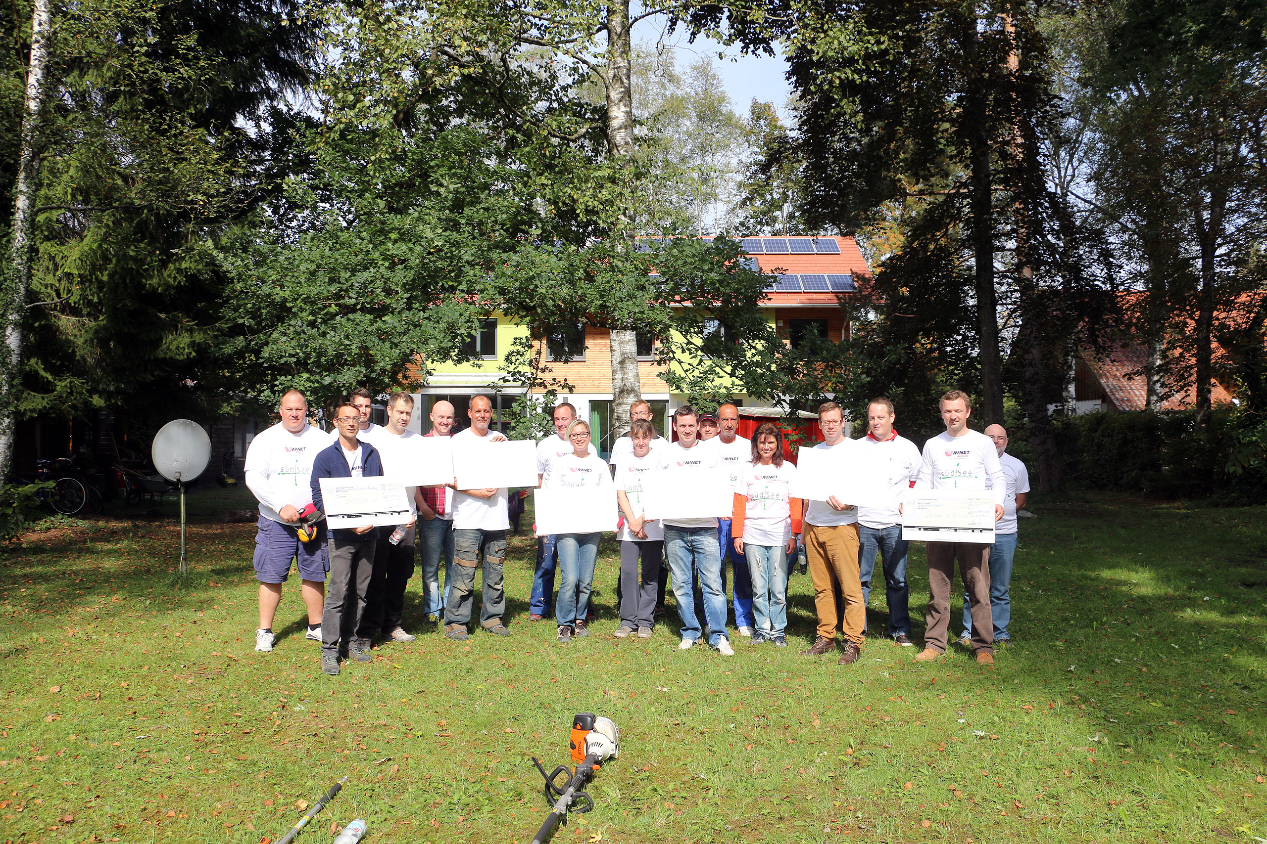 Schon morgens um 9:00 Uhr stehen die ersten hochmotivierten Mitarbeiter des Elektronikzulieferers Avnet-Abacus und dessen Zulieferer Samtec und Vishay vor der Tür des neu erbauten südSee-Hauses. Manche von Ihnen sind dafür sogar extra aus England angereist. Normalerweise kümmern sich diese Menschen um den Vertrieb von elektronischen Bauteilen und Komponenten, sitzen im Büro vor ihren Computermonitoren. Bei der südSee Kinder- und Jugendhilfe kümmern sie sich um Garten, Heckenschnitt, Terrasse und viele andere Dinge rund um das neu gebaute Haus in Seeshaupt. An solchen Tagen kann man jede Hand gebrauchen sagt Manfred Fent, Vorstand beim südSee-Verein und derzeit im Nebenberuf „Bauleiter“ und Organisator des gemeinnützigen Projektes. Das neue Haus ist großartig geworden, ganz auf die Bedürfnisse einer sozialen Einrichtung abgestimmt. Nur im Garten herrscht noch ein wenig „Unordnung“. Aber nicht mehr lange, denn heute ist ja Support-Day! Mit einem „OK, greifen wir an“ gibt Hagen Götze den Startschuss für die 19 Mitarbeiter, die Avnet-Abacus und deren Zulieferer an diesem Tag kostenlos für den guten Zweck zur Verfügung stellen. Schon heult der Dieselmotor des Häckslers auf, verschlingt Äste und Gestrüpp um sie auf der anderen Seite als Hackschnitzel wieder auszuspucken. An einer anderer Ecke im Garten wird Hand, pardon Farbe an ein kleines Gartenhaus angelegt, „Falunrot“, weil das mit den weiss gestrichenen Fensterrahmen so schön schwedisch aussieht. An wieder anderer Stelle hilft der Freiwilligentrupp den Zimmermännern beim Bau einer Holzterrasse. Die Stimmung ist super und die Mitarbeiter von Avnet-Abacus hängen sich mit aller Kraft ins Zeug. Bis Mittag ist schon einiges zu sehen, die Hecke ist gestutzt, das kleine Gartenhaus erstrahlt in freundlichem Rot und auf der Terrasse werden schon die ersten Bretter des Belages verschraubt. Dann ist erst einmal Stärkung angesagt. Der Metzger vom Ort liefert große Körbe mit Salami-, Käse- und Leberkäsesemmeln. Brotzeit! Mahlzeit! Die haben sich die fleißigen Helfer redlich verdient und schliesslich soll niemandem am Nachmittag die Kraft ausgehen. Es ist noch genug Arbeit da, schwächeln darf niemand. Nach der Stärkung folgt erst einmal ein kurzer Fototermin, denn die Mitarbeiter von Avnet-Abacus haben nicht nur ihre Arbeitskraft mit in das neue südSee-Haus gebracht sondern auch noch bei Sponsoren (Samtec, Vishay, Molex, TE Connectivity, Bourns und AVX) Geld für soziale Zwecke gesammelt. Sie überreichen dem Kassier des südSee-Verein, Michael Schmidt, noch einen Scheck über 2250 Euro. Dieser wird dankend angenommen, denn wer eben ein Haus für acht Kinder und Jugendliche gebaut hat, der braucht auch noch das eine oder andere Stück Einrichtung. Scheck übergeben, zurück an die Arbeit. Den ganzen Nachmittag wird geharkt, geschaufelt, werden Steine als Terrassenbegrenzung verlegt und gestrichen. Kurz vor 18 Uhr beginnt ein Teil des Teams von Avnet-Abacus die Feuerschalen im Garten einzuschüren. So klingt dieser Tag im südSee-Haus noch mit einem leckern Barbecue das von Tafelgold gespendet wurde, kalten Getränken und Gesprächen an der Feuerschale aus. Kurz nach Einbruch der Dunkelheit macht sich das Team wieder auf den Weg nach Hause. Es ist viel geschehen an diesem Tag. Im Haus, im Garten und in den Herzen der Menschen. Ein riesiges Dankeschön an all die großartigen und super-motivierten Helfer von Avnet-Abacus, Samtec und Vishay. Ihr habt einen unglaublich tollen Job gemacht und das südSee-Haus an diesem Tag wieder einen großen Schritt weiter gebracht! Danke!