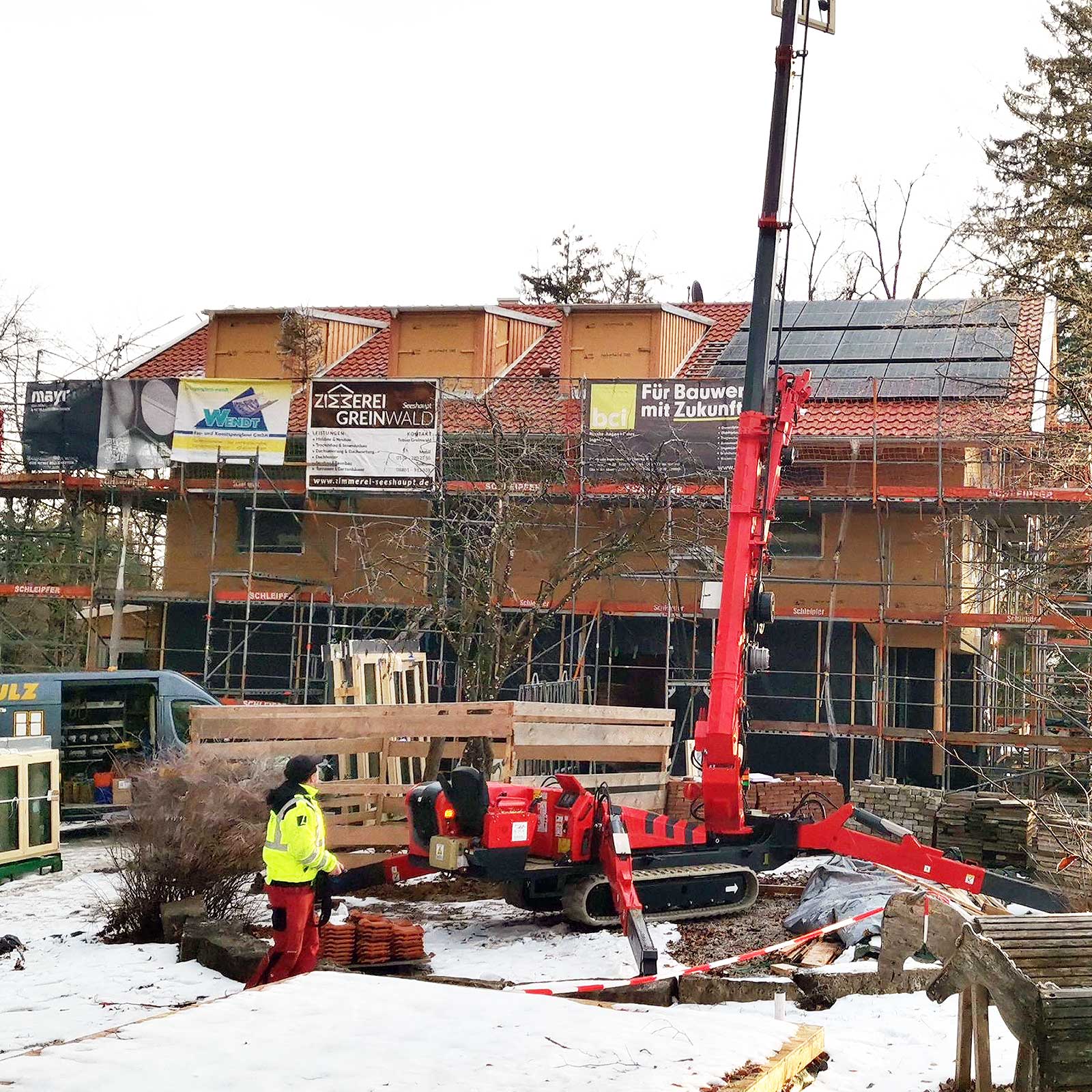 In den vergangenen Monaten haben wir sie Stück für Stück abgebaut – unsere alte Villa. Am Ende war kaum noch etwas übrig: Decken und Dach waren verschwunden, die alte Treppe, die früher in den Speicher führte, lag draußen im Garten zwischen den Sträuchern. Es war fast nur noch der alte Tragebalken im Wohnzimmer mit der Inschrift da. Und natürlich unser Kachelofen und die knarzige Treppe in den ersten Stock. Aber jetzt, endlich, wächst unsere Villa wieder! Auf der bereits betonierten Bodenplatte an der Südseite entsteht in diesen Tagen unser neuer Vollholzanbau. Hier sollen später drei Kinderzimmer und ein neues Wohnzimmer Platz finden – und darüber, unter dem Dach, ein großer Gemeinschaftsraum für alles, was das Leben so bringt.