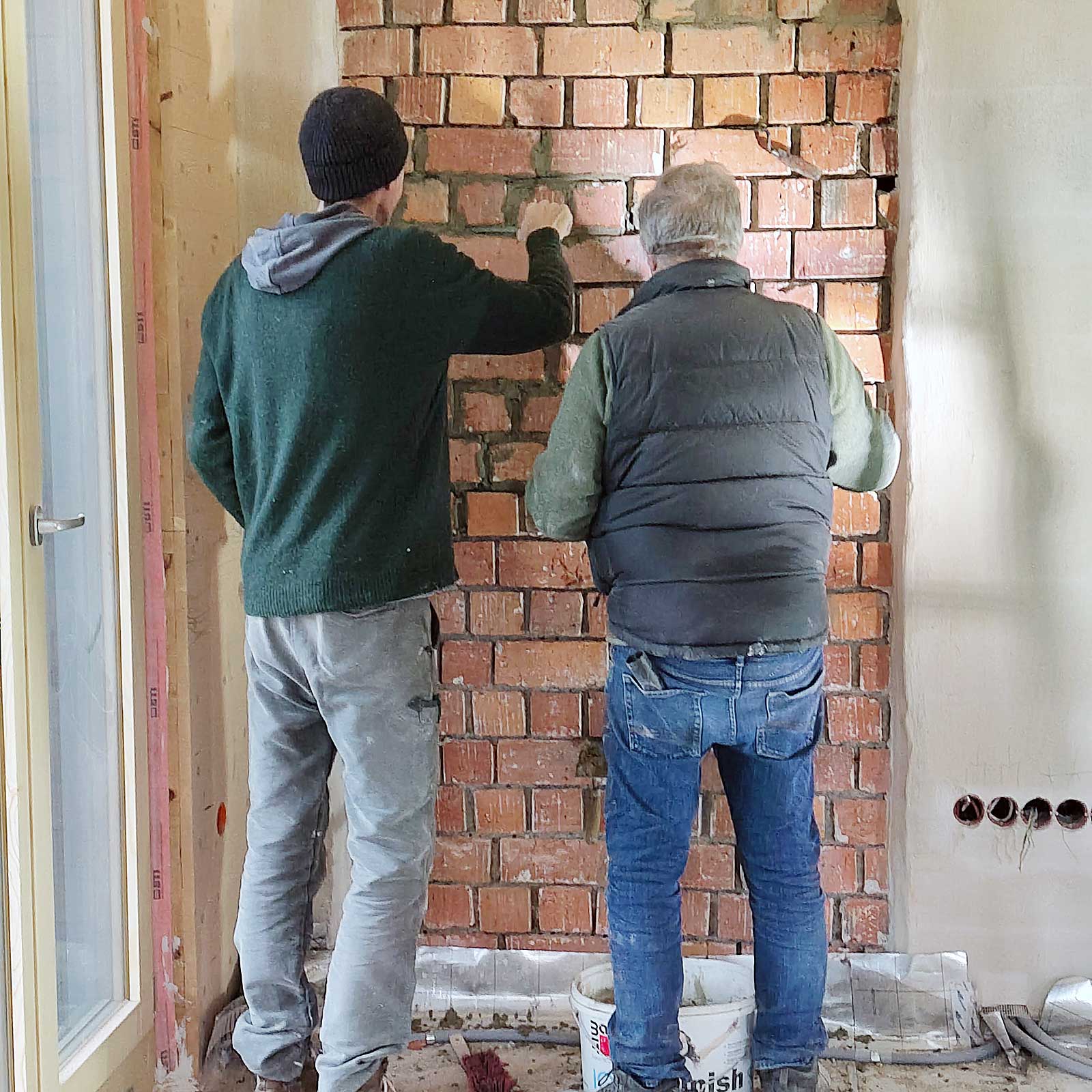 Auch auf die südSeeler wartet eine besondere Aufgabe. Im Wohnzimmer soll ein Stück der alten Außenmauer sichtbar bleiben – als Erinnerung an das Haus in seiner ursprünglichen Form. Gemeinsam machen wir uns ans Werk: Zuerst reinigen wir die alten Klinker, anschließend werden sie neu verfugt. Mit hilfreichen Tipps von den Profis klappt das erstaunlich gut und recht zügig. So entsteht im Wohnzimmer eine südSee-Gemeinschaftswand. Diesen fleißigen Frühlingsnachmittag lassen wir dann gemeinsam am Lagerfeuer ausklingen. Und bei den inzwischen deutlich milderen Temperaturen fühlt sich das doppelt schön an. Man merkt: Mit dem Frühling kommt nicht nur neues Leben in den Garten – sondern auch auf unsere Baustelle.