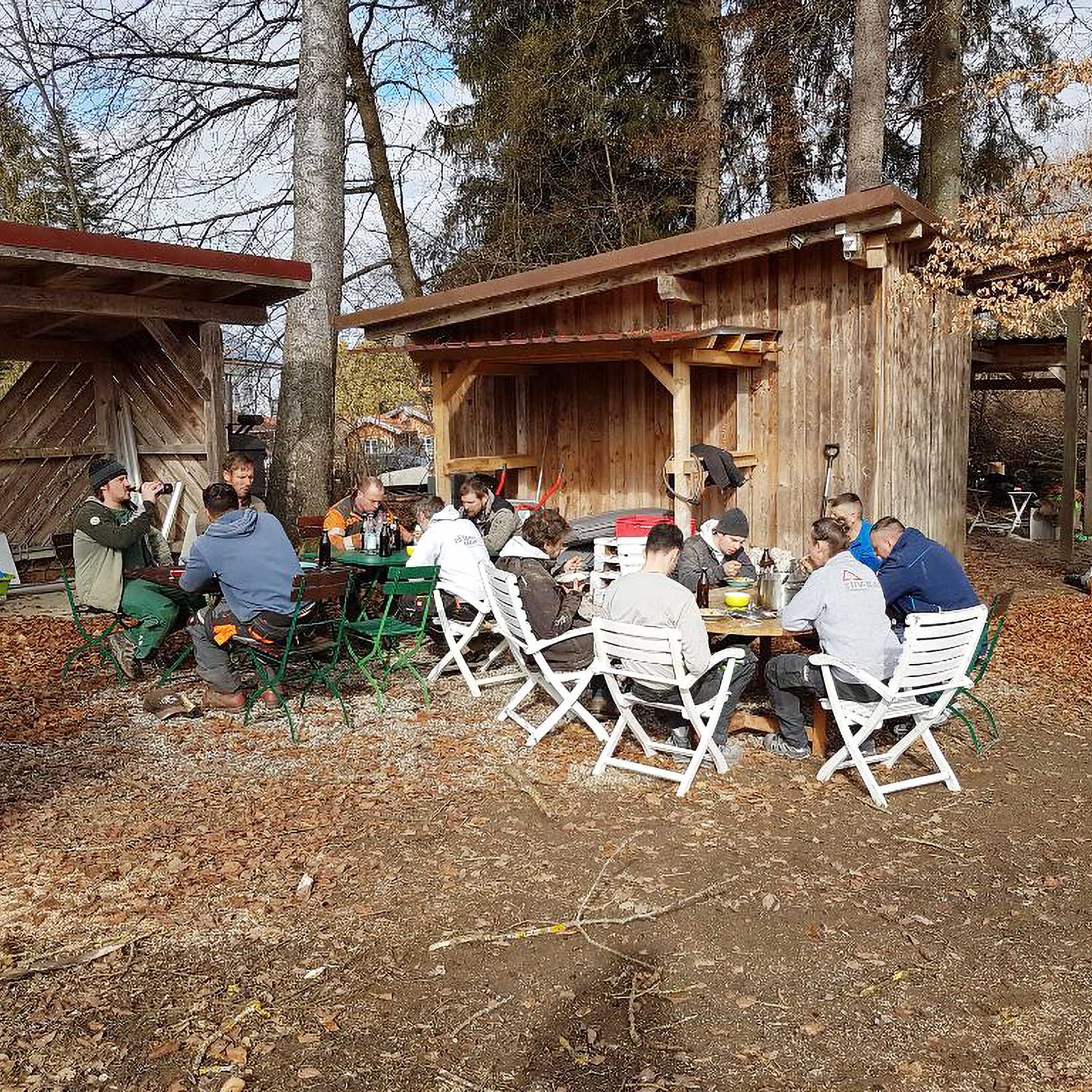 Im ersten Stock sind die Installateure am Werk, und wir können uns vorstellen, wie die Bäder eines Tages aussehen werden. Ein besonderes Highlight für die Betreuer*innen wird dabei das kleine Erwachsenenbad sein, das direkt an das Schlafzimmer angrenzt. Zum Glück verkleiden die Zimmerer die Fenster mit Folien. So konnten wir im alten Anbau ein kleines Stüberl für die Brotzeit einrichten. Dort können sich die fleißigen Handwerker zumindest mittags ein wenig aufwärmen und gemeinsam eine Pause machen. Und als wir schließlich auch noch das „Okay“ vom Kaminkehrer bekommen, dürfen wir sogar den noch bestehenden Kachelofen einheizen. So wird es auf unserer Baustelle plötzlich fast gemütlich – trotz winterlicher Temperaturen draußen.